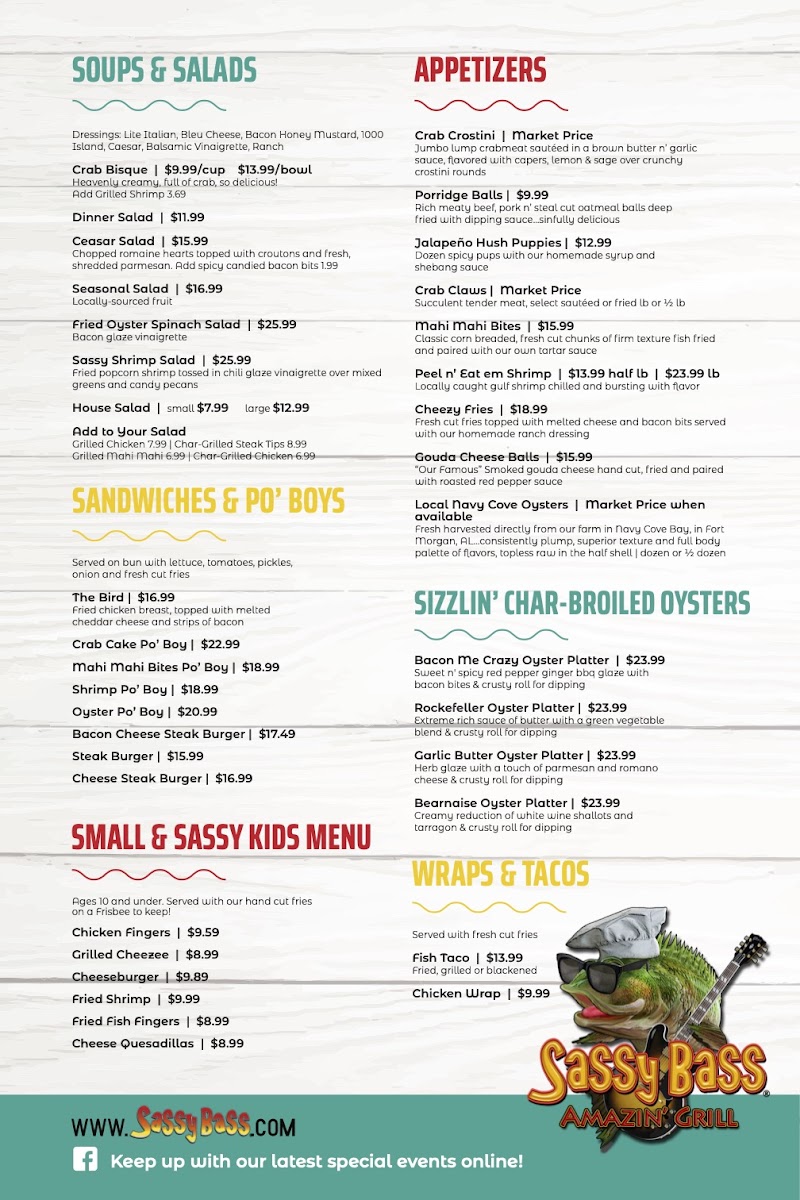 Welcome to Sassy Bass Amazin' Grill, located in the heart of Gulf Shores, Alabama. This culinary gem offers a delightful menu that tantalizes the taste buds with unique breakfast and lunch options. Start your day with the Crabby Beach Benny, a luscious combination of crab cake, poached eggs, and hollandaise, or indulge in our Brassy Bites Beignet Balls for a sweet treat.
